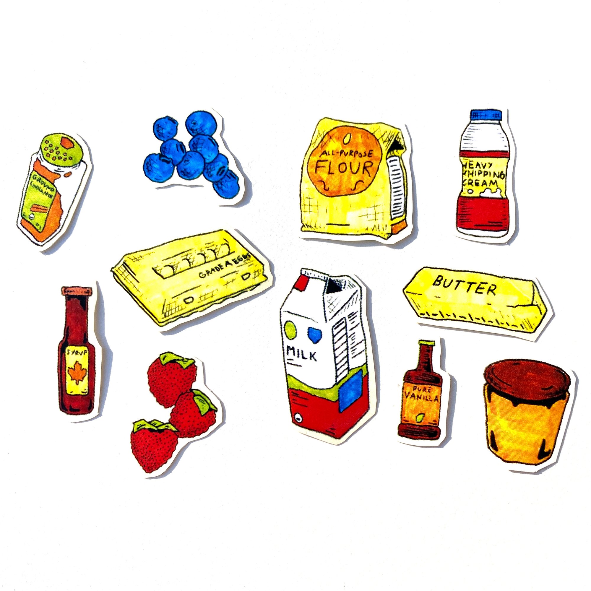A selection of essentials for any baker or breakfaster. Stickers come loose inside a folded protector, so you don't have to pry them off a sheet. Includes cinnamon, blueberries, flour, whipping cream, eggs, syrup, milk, butter, strawberries, vanilla extract, and a jar of jam.